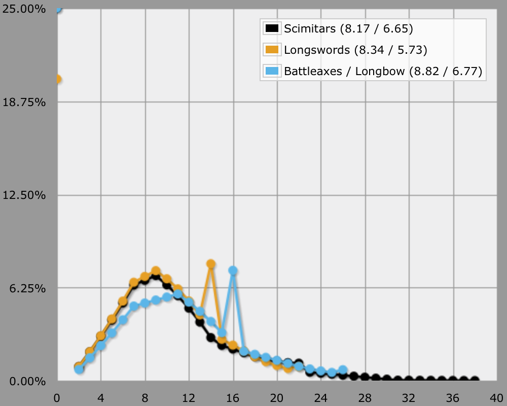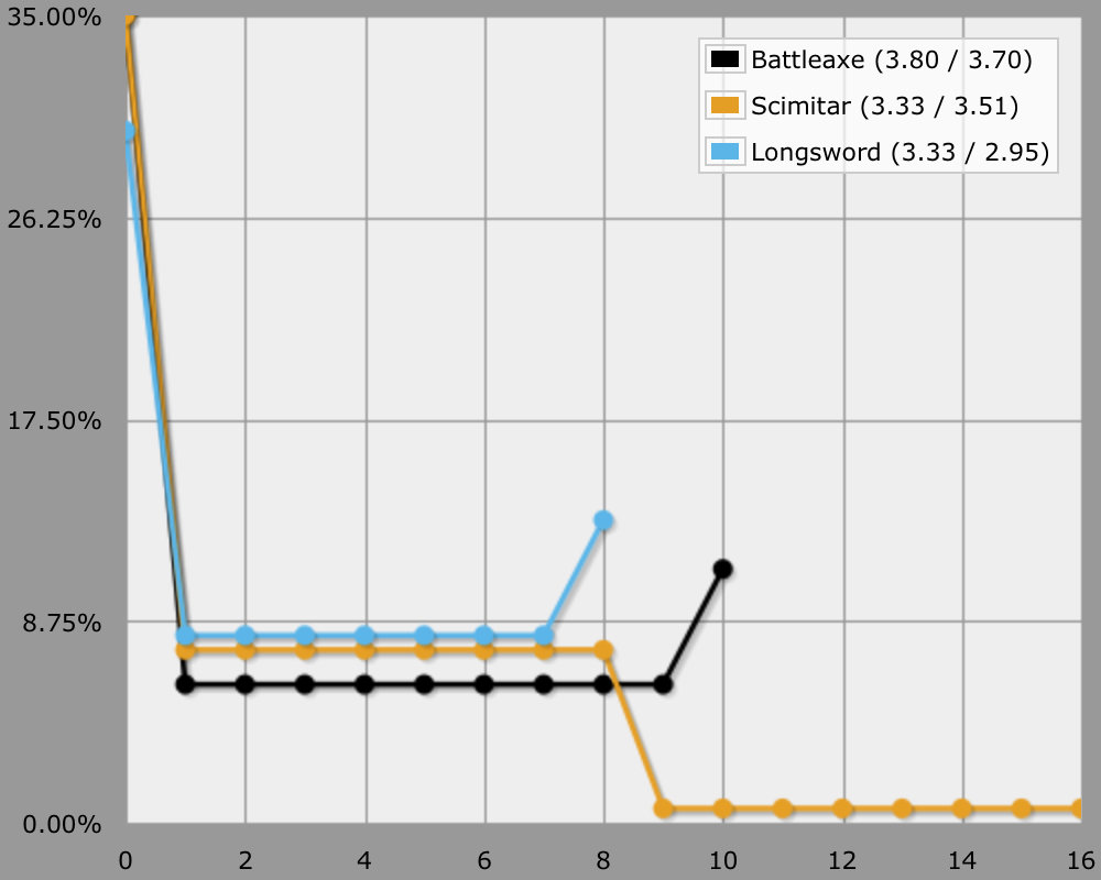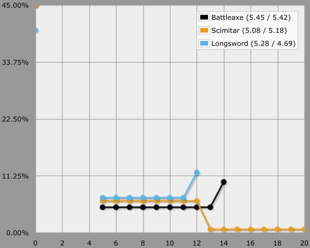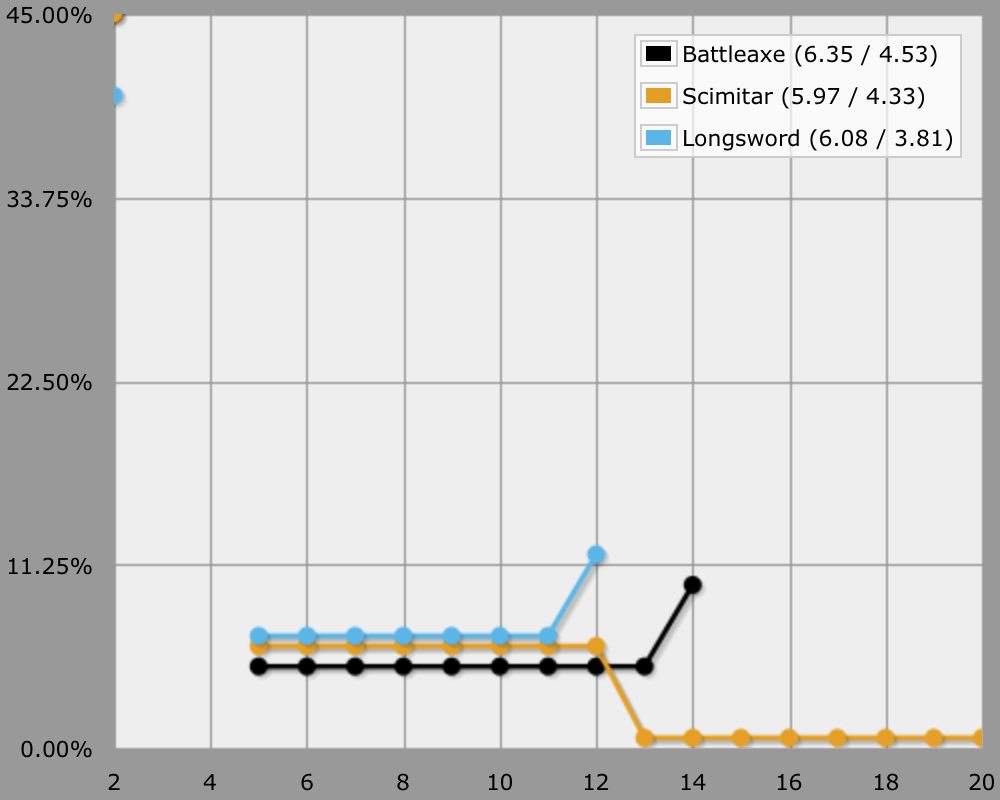 So which weapon is best? It depends on what you're looking for. The BattleAxe deals the highest average damage. The Longsword hits more often, but also deals the lowest maximum damage. The Scimitar deals the lowest average damage, but it has the highest maximum damage.