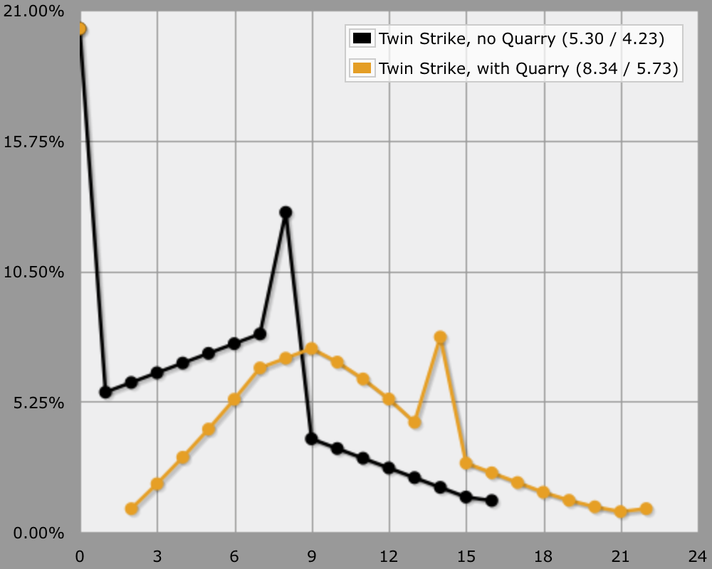 We've seen how we can compare single attacks in AnyDice, but what if multiple attacks are involved at the same time? And what if those attacks influence each other in some way? The Ranger's Twin Strike attack combined with the Hunter's Quarry class feature is the quintessential example, so let's use that. Our test case is a level 1 Ranger with a Dexterity of 18, once again attacking enemies with AC 12–22.