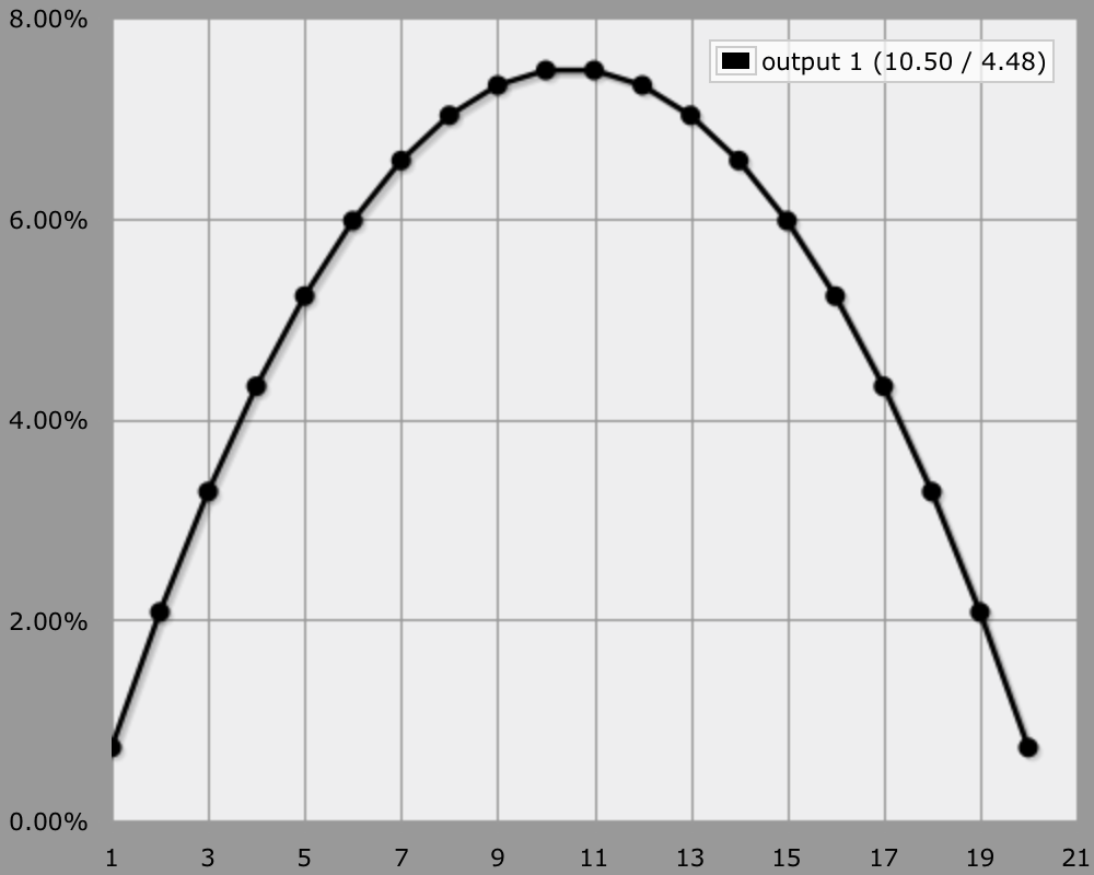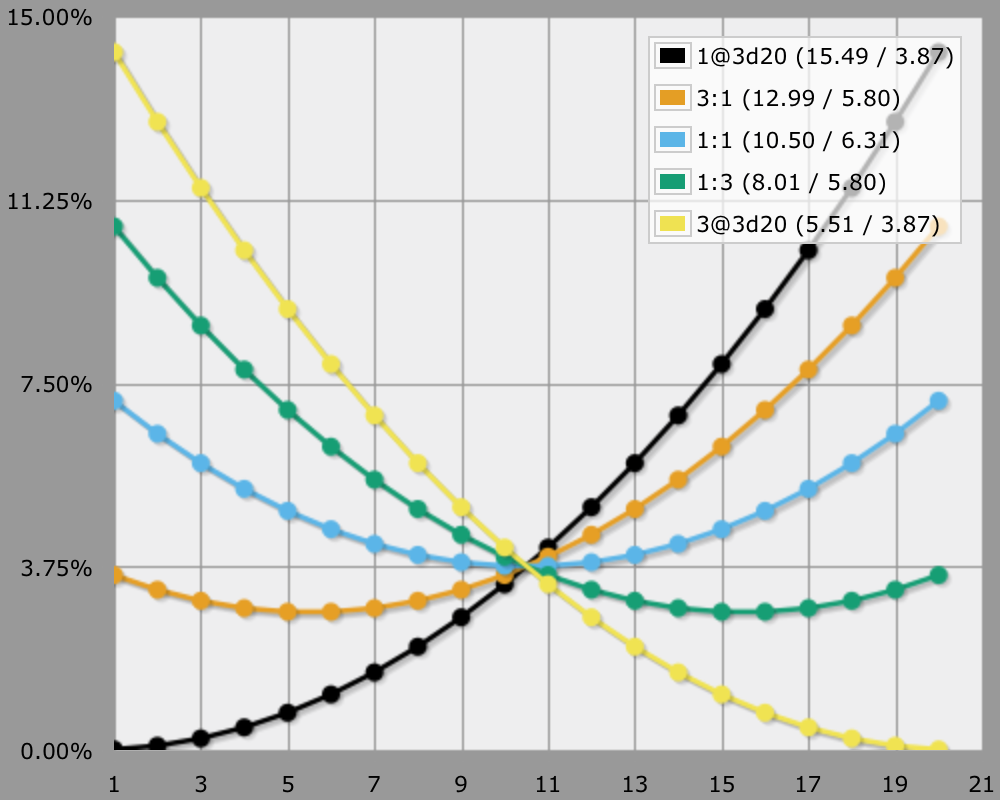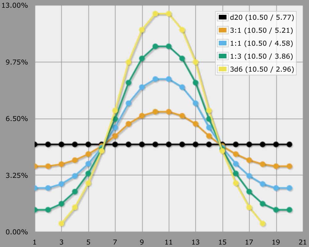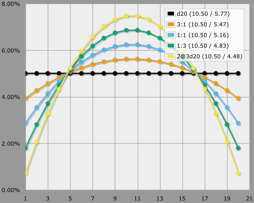 Suppose you're using a 1d20 mechanic, but would like to curve the distribution, while keeping the same 1–20 value range. Taking the middle of 3d20 is a nice solution for that. You can do that with AnyDice by using 2@3d20. But what if that curves too much for your taste?