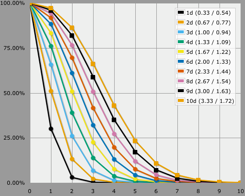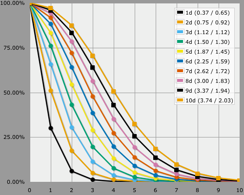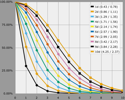 Note that the odds for at least one success are the same as the 10-again option. Only the odds for more than one success get a boost.